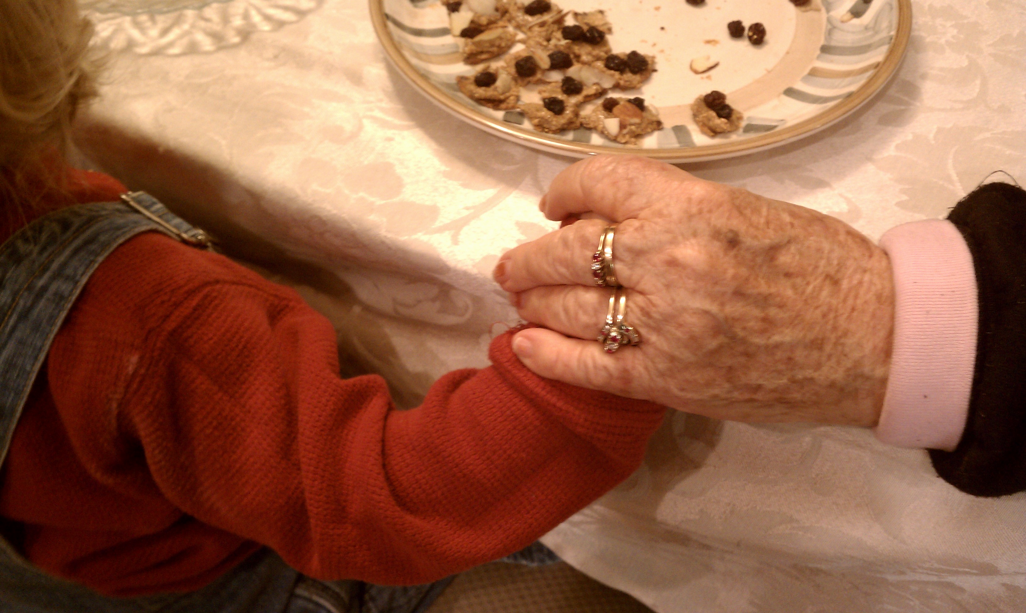 Today my house is very quiet, a little too quiet. We just had a lovely four-day visit with my sister and cousin Sunshine and her 2-year old Byron, who may be the next Einstein (you heard it here first, folks). This made five generations in our house: Nanny, representing the Silent Generation; my husband, representing the Baby Boomers; me, my sister and cousin, representing Gen X; The Girls, representing the Millennials; and Byron, representing Generation Z. You might think we would have a hard time coming up with an activity that appeals to so many different generations – at our house such an occasion calls for a tea party! Our menu included traditional tea sandwiches (sliced cucumber or homemade cheese spread on thin buttered white bread), shrimp, tiny crackers with almond butter and raisins, sorrell jam, and two kinds of tea. We broke out the china and the crystal, and even laid a tablecloth for good measure. We also had a guest, Cole, who by luck was musically inclined and so also qualified as entertainment. We put him in the hot seat, next to Nanny.